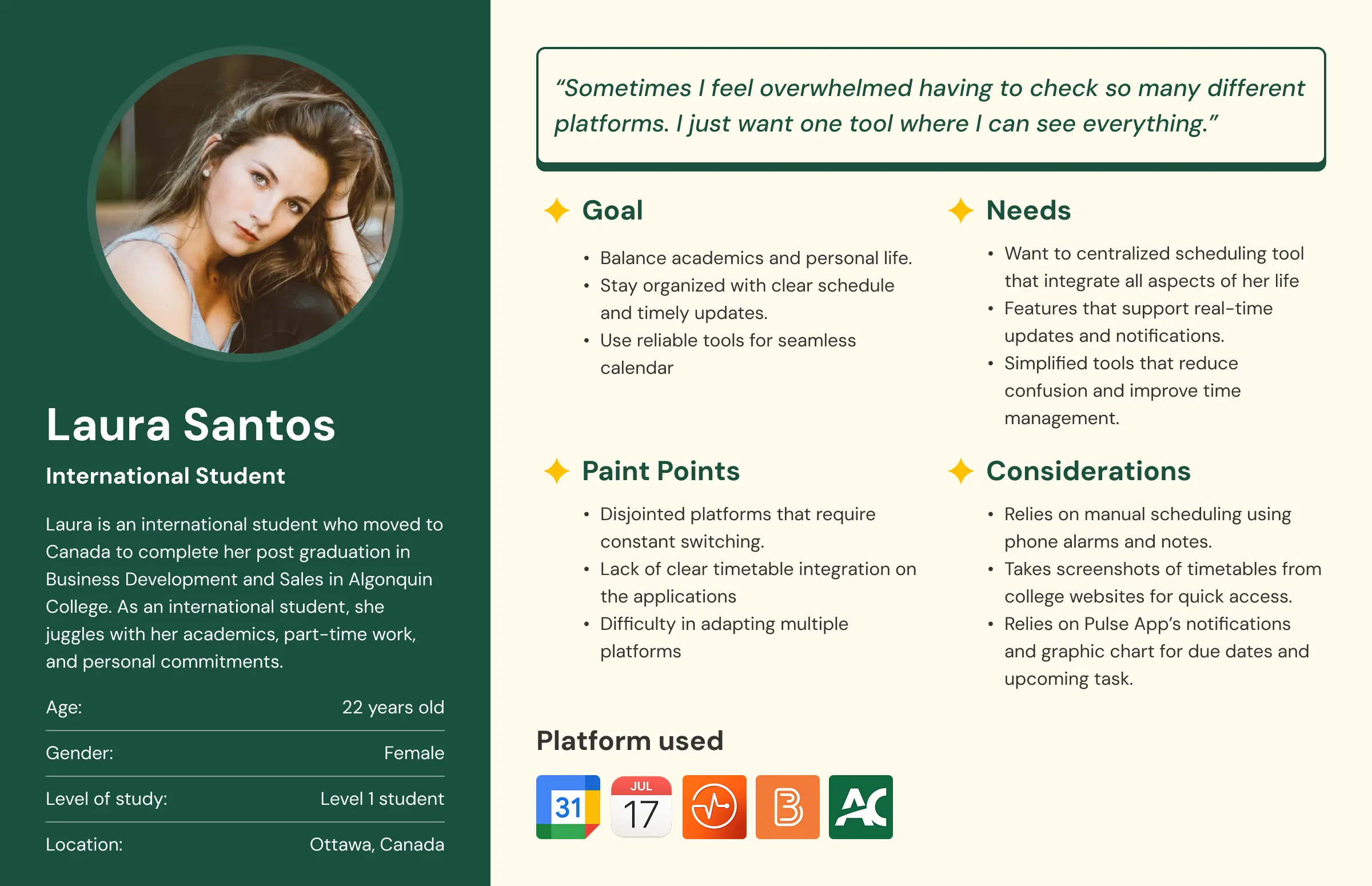 The onboarding process plays a vital role in helping new students at Algonquin College transition smoothly, especially international students. Moving to a new country for education requires significant effort to balance personal life, academics, and work effectively. Because of that, having tools for time management is important which helps students plan and organize their duties more efficiently. Algonquin College offers various calendars to help students track academic and campus events. However, new students may struggle to familiarize themselves with multiple college-provided calendars from the beginning. They may also find it overwhelming to identify and use the specific calendars they need from various sources, making it difficult to manage their responsibilities effectively.
